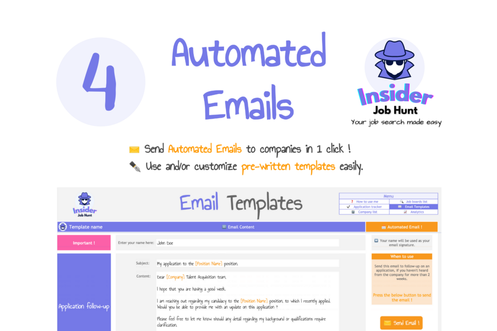 ✉️ Automated Email Templates ----- Send pre-written emails to recruiters and companies at the click of a button.